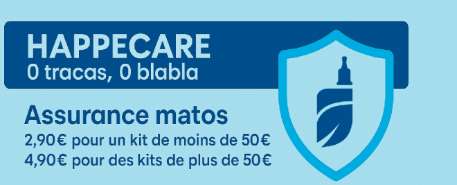 HAPPECARE est une garantie complémentaire proposée au tarif de 2,90€ pour les kits de moins de 50€ et 4,90€ pour les kits de plus de 50€.
